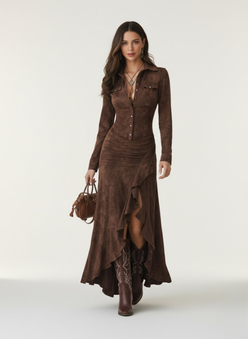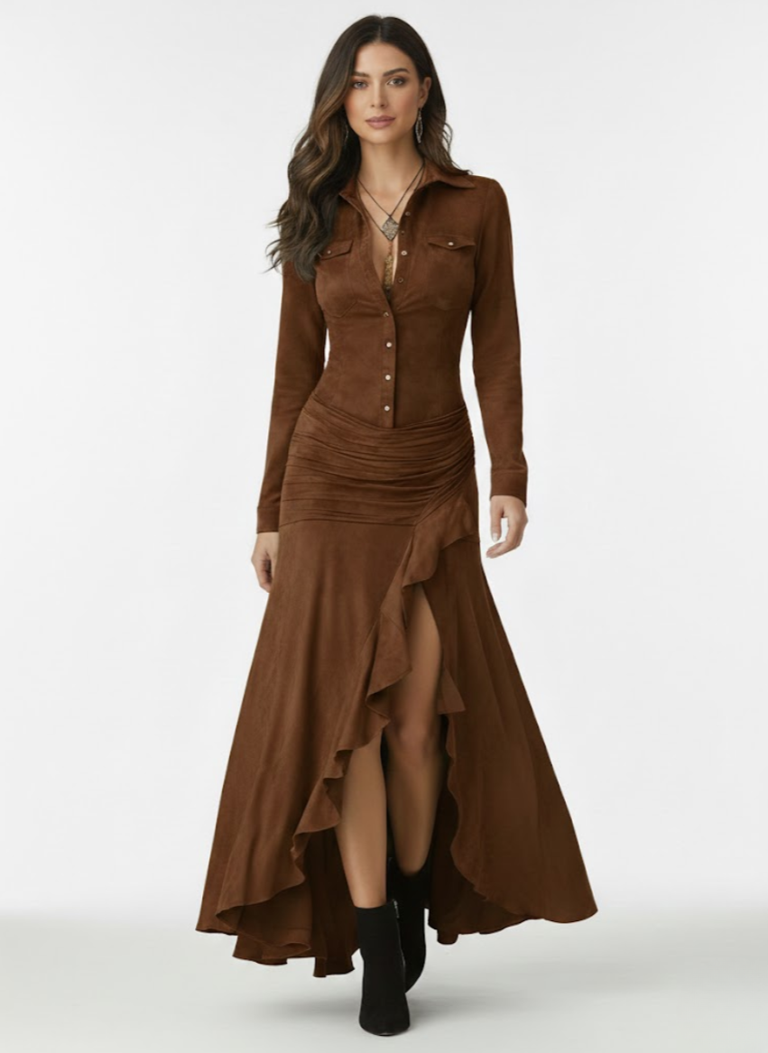 Cette robe longue élégante incarne une féminité raffinée et naturelle, pensée pour les femmes qui apprécient un style élégant sans effort. Sa ligne longue et fluide est sublimée par de délicats volants qui accompagnent harmonieusement les mouvements du corps, créant un effet léger et gracieux à chaque pas.