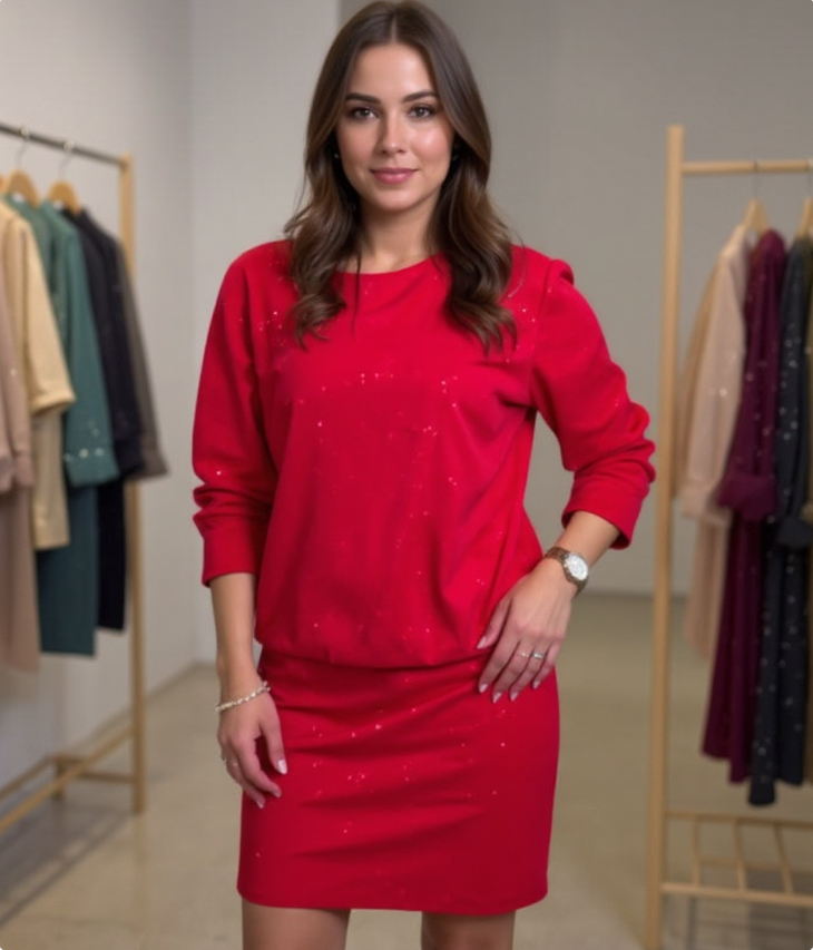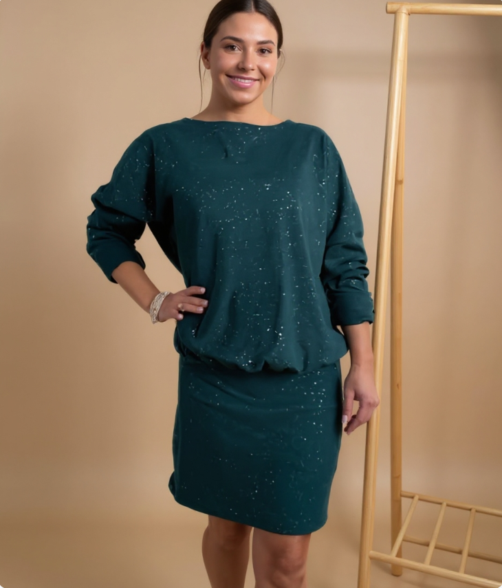 Dotée de manches longues et d’un col rond discret, la robe affiche une élégance sobre et rassurante. Sa structure souple et agréable au toucher épouse harmonieusement le corps et procure une sensation de bien-être tout au long de la journée. Sa longueur au genou la rend idéale pour de nombreuses occasions : sortie en ville, journée de travail détendue ou dîner convivial.